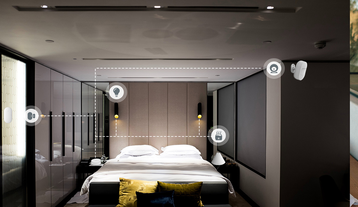 With peaceful sleep enabled, a cozy sleeping atmosphere comes with lights off and air conditioners and humidifiers timed. Contact sensor and PIR linked for night security to give you peace of mind. Sleep mode coupled with security mode guard your sleep all night.