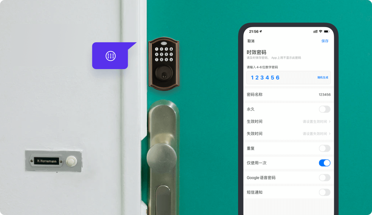 用户可随时随地创建并使用临时密码,无需本地激活设备 临时密码包含一次性密码和周期性密码,一次性密码在⻔锁断⽹时也可使⽤,周期性密码满足各种自定义时间段使用需求;