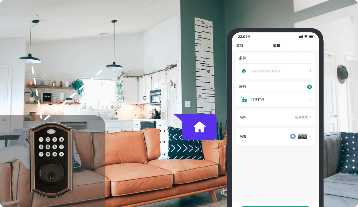 在涂鸦,锁不仅仅是一个智能单品,它可以与全屋家居场景联动。开门后,玄关灯打开,电动窗帘缓缓合上,热水器定时打开,营造一个美好舒适的归家体验。
